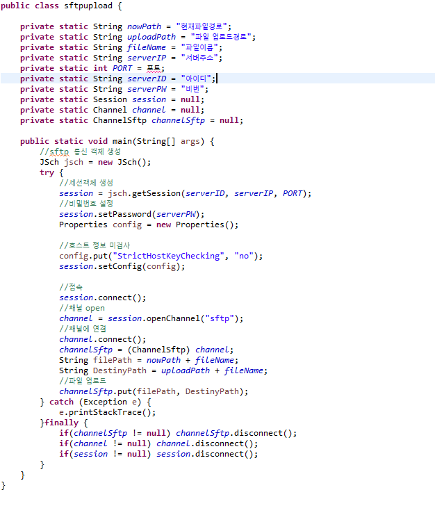 통신객체 생성 -> 세션객체 생성 -> 접속 -> 채널오픈 -> 파일 업로드로 구성됩니다.